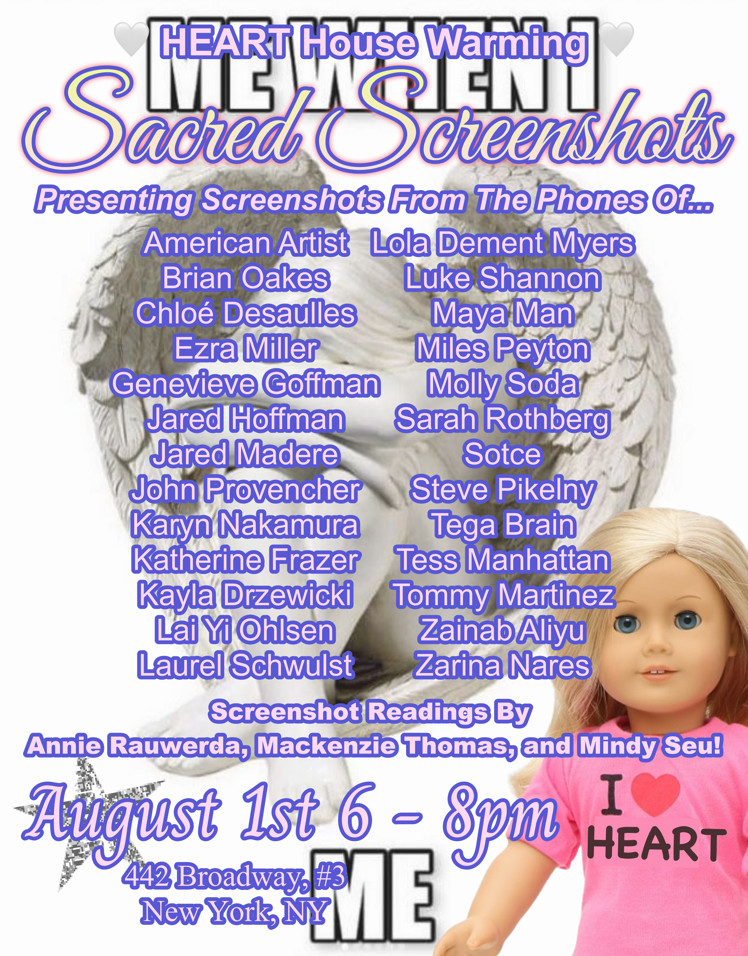 I am writing to share with you that HEART’s house warming exhibition 𝓢𝓪𝓬𝓻𝓮𝓭 𝓢𝓬𝓻𝓮𝓮𝓷𝓼𝓱𝓸𝓽𝓼 opens this Thursday night, August 1st, at 6pm. It features 26 of my favorite NYC-based artists who each chose a “sacred screenshot” from their phone to be featured in the show.